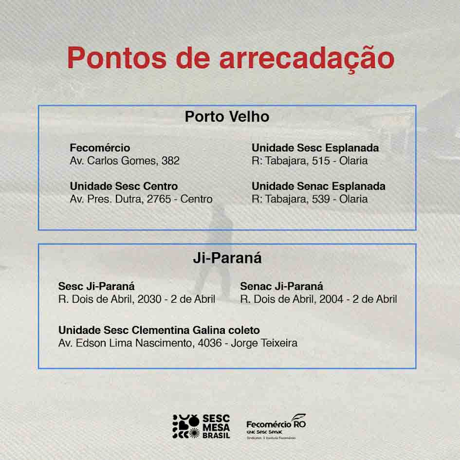 Para os doadores que desejam contribuir com doações financeiras –, a chave pix para depósitos é a mesabrasil@sescro.com.br. A campanha acontece até o dia 18 de setembro.