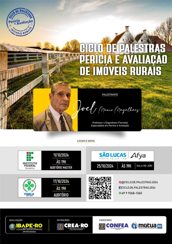 O Ciclo de Palestras, promovido pelo IBAPE/RO, conta com o patrocínio do CREA-RO e o apoio do CONFEA e da MÚTUA-RO. Ele será realizado em três encontros, distribuídos por importantes instituições de ensino de Porto Velho. O primeiro evento está agendado para o dia 11 de outubro, no Auditório Master do Instituto Federal de Rondônia (IFRO), no Campus Calama. O segundo, no dia 17, ocorrerá no auditório do Centro Universitário Aparício Carvalho (FIMCA) e Faculdade Metropolitana, e o ciclo será encerrado no dia 25, no Centro Universitário São Lucas – Afya, na sala do Júri. Todas as palestras terão início às 19h.
