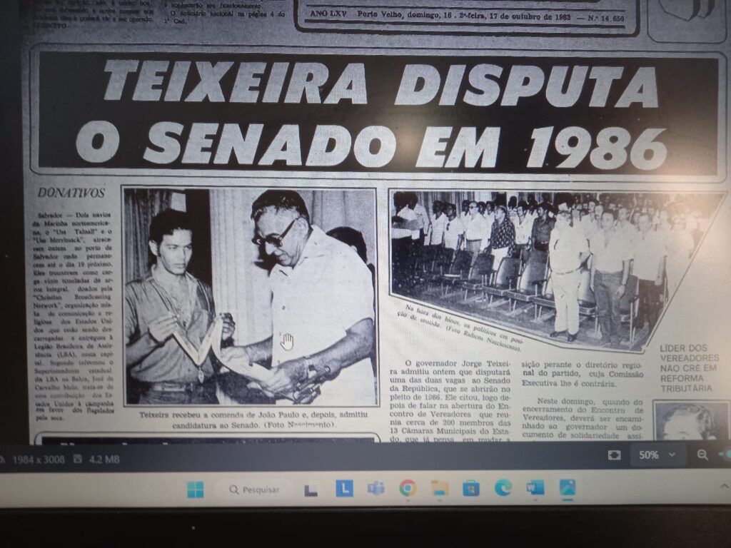 1983 – Na 1ª vez que fala publicamente do assunto, o governador Jorge Teixeira admite a possibilidade de ser candidato ao Senado em 1986.