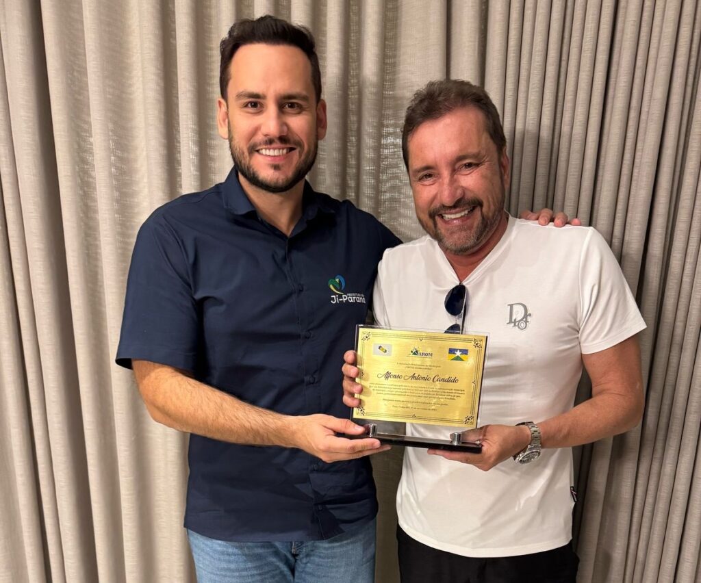 Na terça-feira, 25, o presidente da Associação Rondoniense de Municípios (AROM), Hildon Chaves, reuniu-se com o prefeito de Ji-Paraná, Affonso Cândido, para reforçar o compromisso da entidade com o fortalecimento do municipalismo no estado. Durante o encontro, Chaves entregou ao gestor ji-paranaense uma placa de homenagem em reconhecimento à sua eleição e à sua atuação à frente do município.