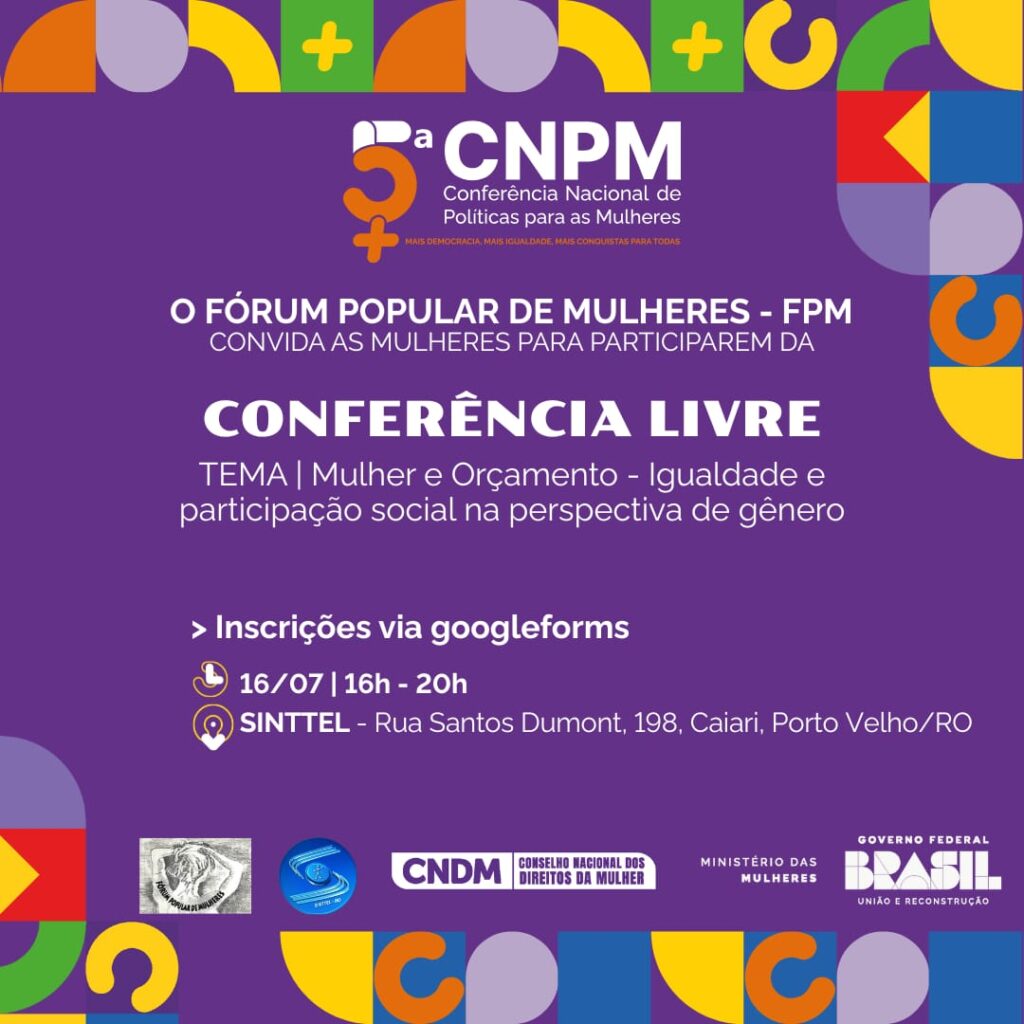 Conferência Livre de Política para as Mulheres Convida à Participação Popular Luana Sayonara 8 meses atrás Temática: Mulher e Orçamento – Igualdade e Participação Social na Perspectiva de Gênero Inscrição para Conferência Livre preparatória para a 5ª CNPM: https://forms.gle/A7rz6mHNKyJ9sYZE6