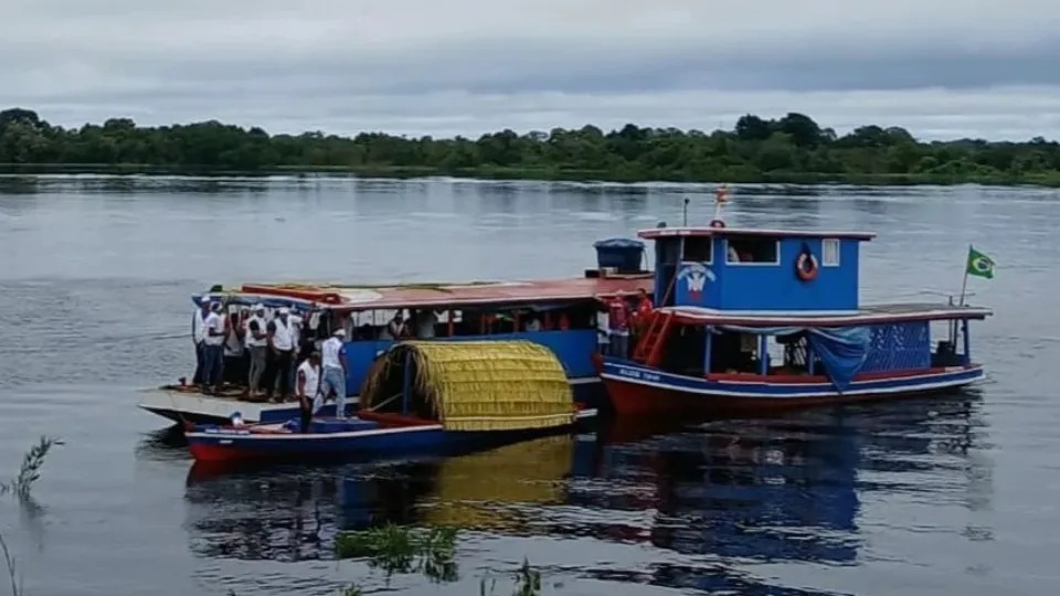 Com cobertura de palha, a igarité do Divino só desatraca do barco quando está a uma hora do próximo local da Festa.