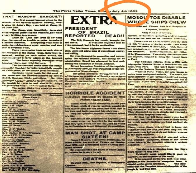 O jornal The Porto Velho Times, inteiramente redigido em inglês – língua falada pelos construtores da Estrada de Ferro Madeira-Mamoré, vem trazendo a informação sobre o primeiro banquete anual maçônico”, realizado no Campo 11 da ferrovia, relacionando também o roteiro das atividades e as personalidades presentes.