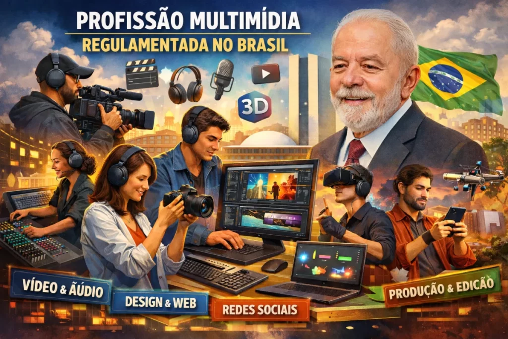 O presidente da República, Luiz Inácio Lula da Silva, sancionou nesta quarta-feira (7) a lei que regulamenta oficialmente o exercício da profissão de multimídia no país. A norma estabelece atribuições, define o campo de atuação e reconhece o papel do profissional multifuncional que atua na criação, produção e gestão de conteúdos digitais e audiovisuais em diferentes plataformas.