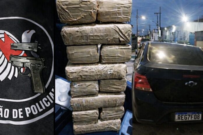 No interior do carro, os militares apreenderam 11 tabletes de substância aparentando ser maconha, dois celulares danificados e uma pistola Taurus calibre .380 com 16 munições, sendo uma delas picotada.
