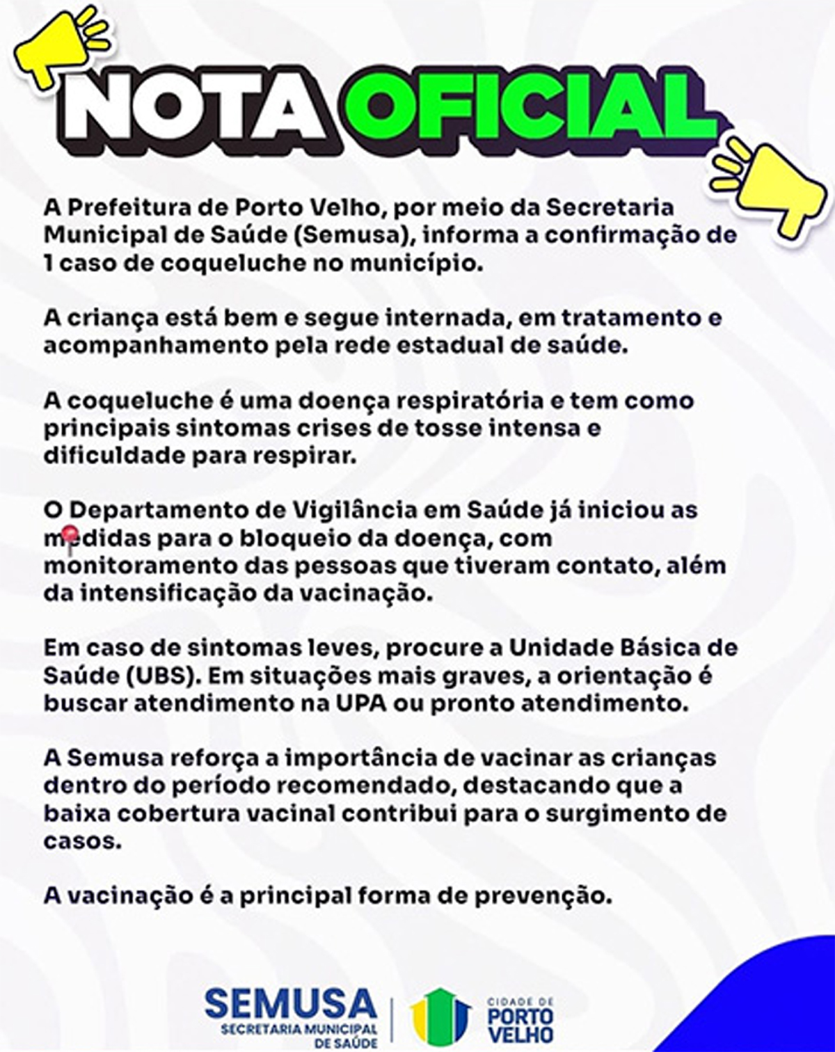 A Prefeitura de Porto Velho, por meio da Secretaria Municipal de Saúde (Semusa), informa a confirmação de 1 caso de coqueluche no município. A criança está bem e segue internada, em tratamento e acompanhamento pela rede estadual de saúde.